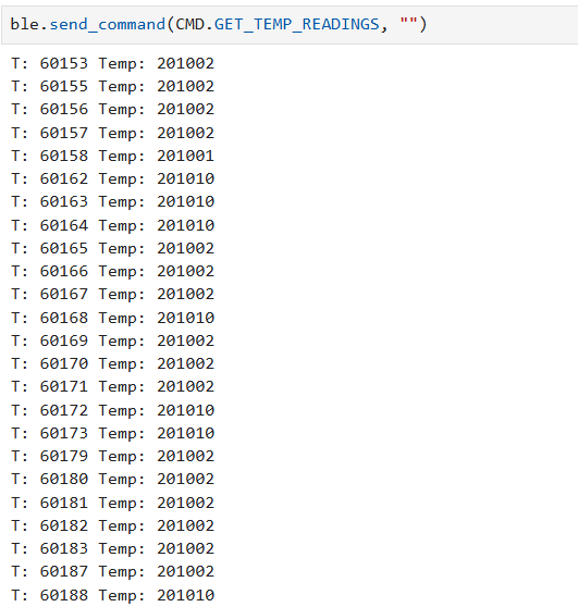 The main difference between the two methods discussed above is individual versus batch data processing. The utility of each transfer method differs based on the specific application for which BLE is being used. For instance, if data collection is performed for later analysis, then the batch processing method is more effective. However, if the data is very time-sensitive meaning that each reading could lead to the robot making a decision,it is better to use the first method and process each reading individually. The advantage of the first method is that it does not require a large amount of storage space to maintain lengthy arrays. However, it is significantly slower than its counterpart. The second method was able to send 10 messages in 9 ms, which corresponds to approximately 1111.1 messages per second. Each message was 22 bytes long, resulting in a data rate of 24,444.4 bytes per second. The main disadvantage of the second method is that it requires storing potentially large amounts of data on board a microcontroller with limited resources.The amount of data that can be stored and sent greatly depends on the type of data being communicated. The MCU has 393,216 bytes of memory, so if each message is maximized to 255 bytes, up to 1,542 messages can be sent before running out of memory.