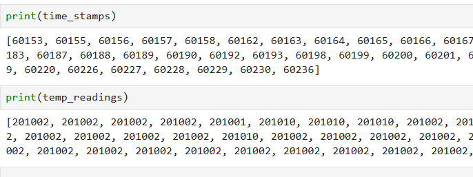 Data was parsed using Python's split() function to separate timestamps and temperature values. The values were converted to integers and stored in their respective lists.